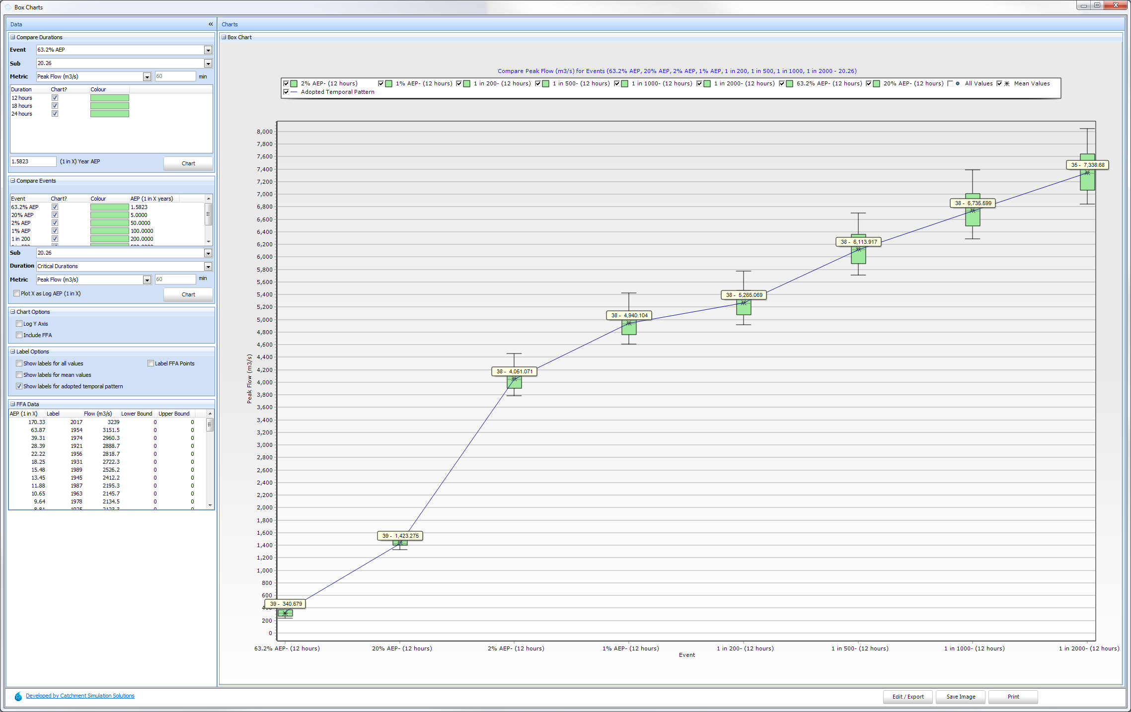 Flood Frequency Analysis data can also be displayed in this chart. It can be imported (from Flike or CSV) by right click in the FFA Data panel. It can then be included in the chart using the 'Include FFA' option in the Chart Options panel. At this points, events, their labels and confidence limits (where available) can be controlled by the Legend check boxes and Chart and Label options panels. This chart can then be used to verify how well (or not) the design events fit with a FFA analysis as shown in the example below.