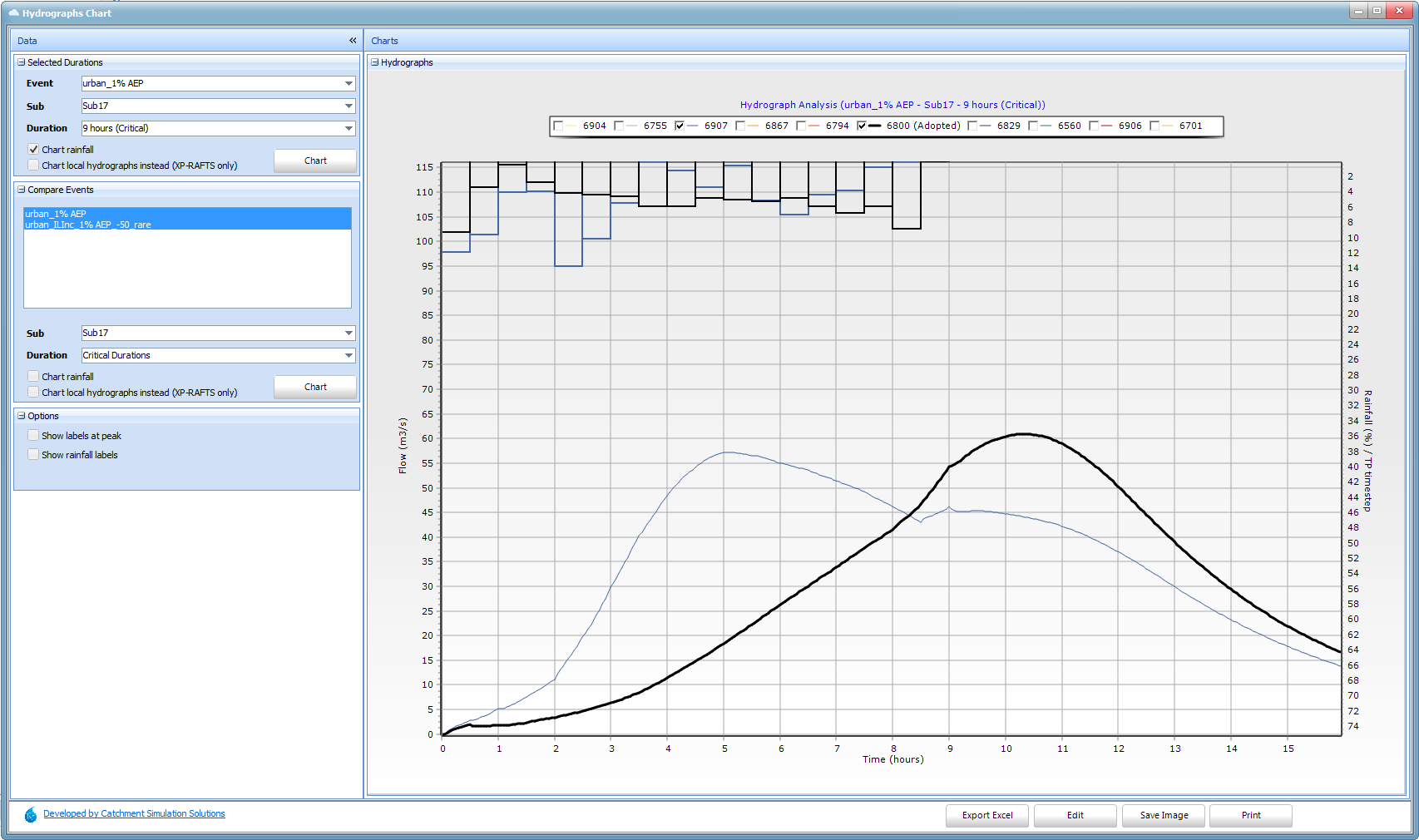 The hydrograph for any AEP, subcatchment, duration can also be plotted using the 'Hydrograph Charts' button. The hydrograph associated with the adopted temporal pattern will be displayed as a thicker line with a '(Critical)' suffix in the legend. Rainfall hyetographs can also be displayed using the 'Chart Rainfall' checkbox. The colours of the series can be edited using the Edit button. Labeling of peaks and rainfall values can be tailored via the Options panel.