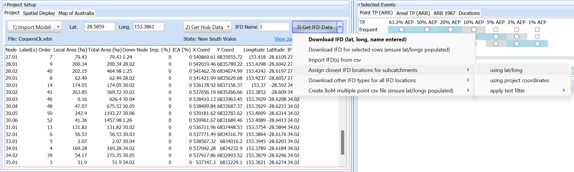 6.Select the appropriate rows in the subareas section (use ctrl key to multiple select) and download ARR 2016 IFD Data using the drop arrow on button 3) Get IFD Data >> Download ARR 2016 for selected rows.