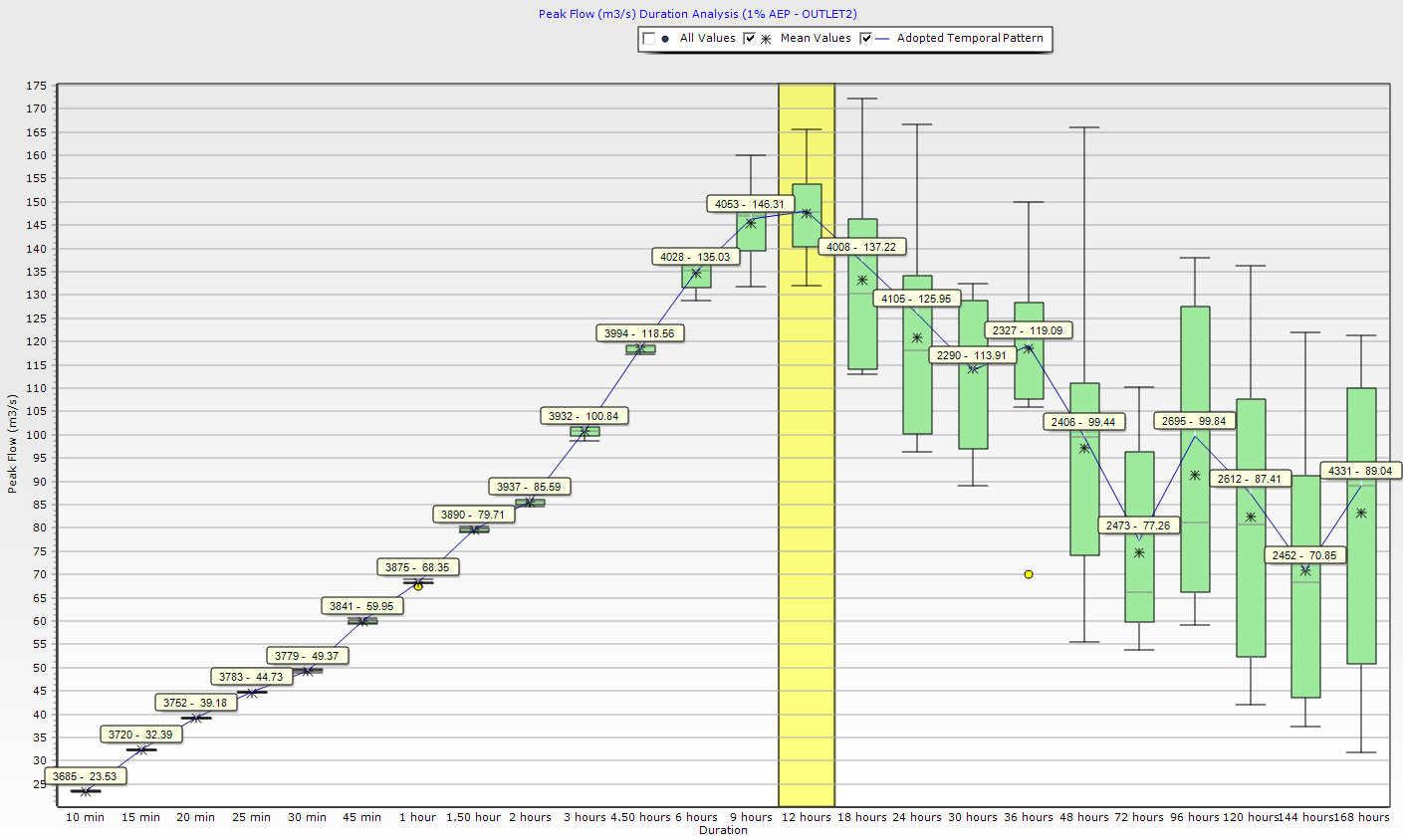 11.Repeat buttons 5) Prepare Model Runs, 6) Run Models and 7) Process Results. You may get a Baseflow warning which you can ignore in this case. Once processed, you can click Box Charts and click Chart in Compare Events panel to view the range of results. You should see a full range of ensemble results with critical durations ranging from 6 - 12 hours.