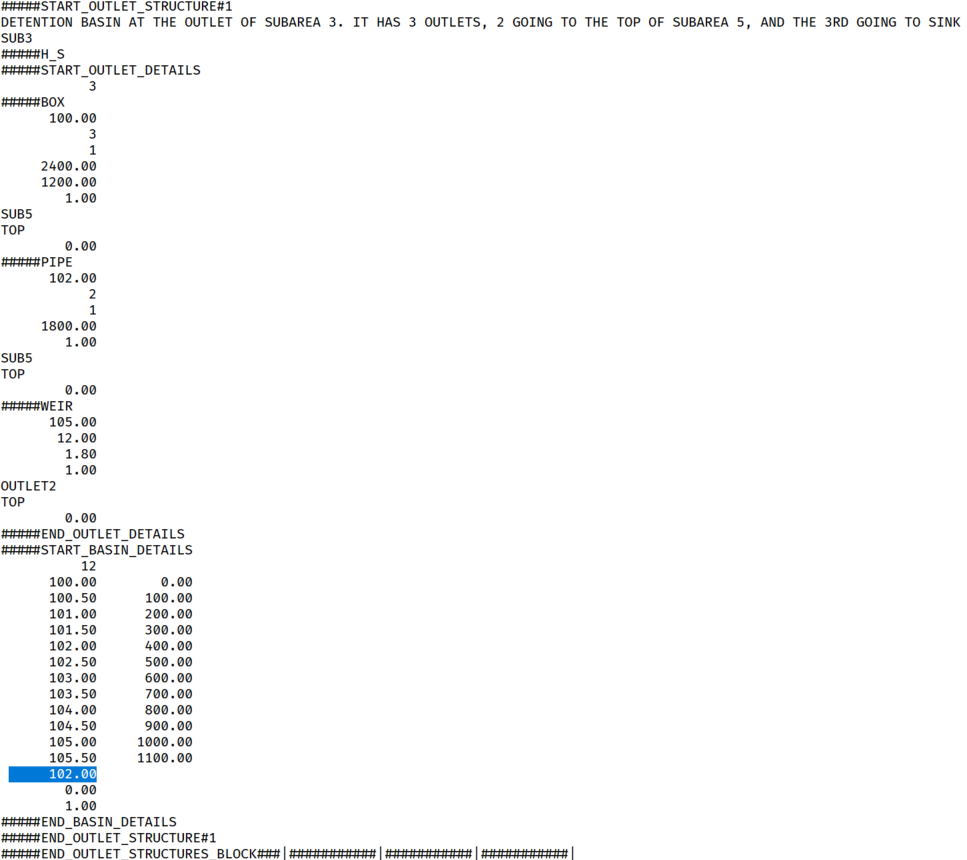 An outlet structure (flood detention basin) is at the outlet of subarea 3. It is H_S type, ie you enter the culvert & weir dimensions and the discharge relation is automatically calculated. All culverts have inlet control. There are 3 outlets: 3 2400*1200 mm box culvert discharging to subarea 5; 2 1800 mm pipe culverts at elev 102.0 discharging to subarea 5; and a 12.0 m long weir at elev 105.0 discharging to OUTLET.