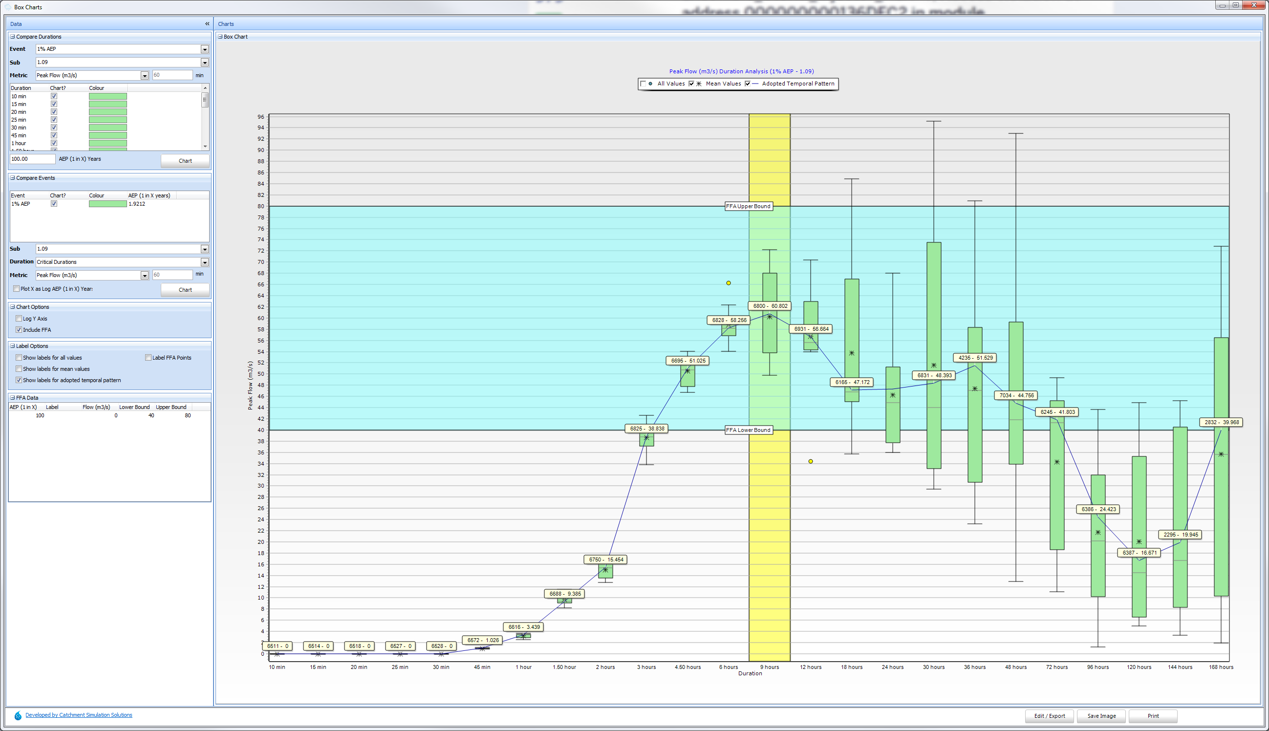 The Compare Durations chart displays box and whisker charts for the selected durations with equal spacing on the X axis in ascending order. The critical duration (based on highest mean peak flow in the ensemble) is highlighted in yellow.