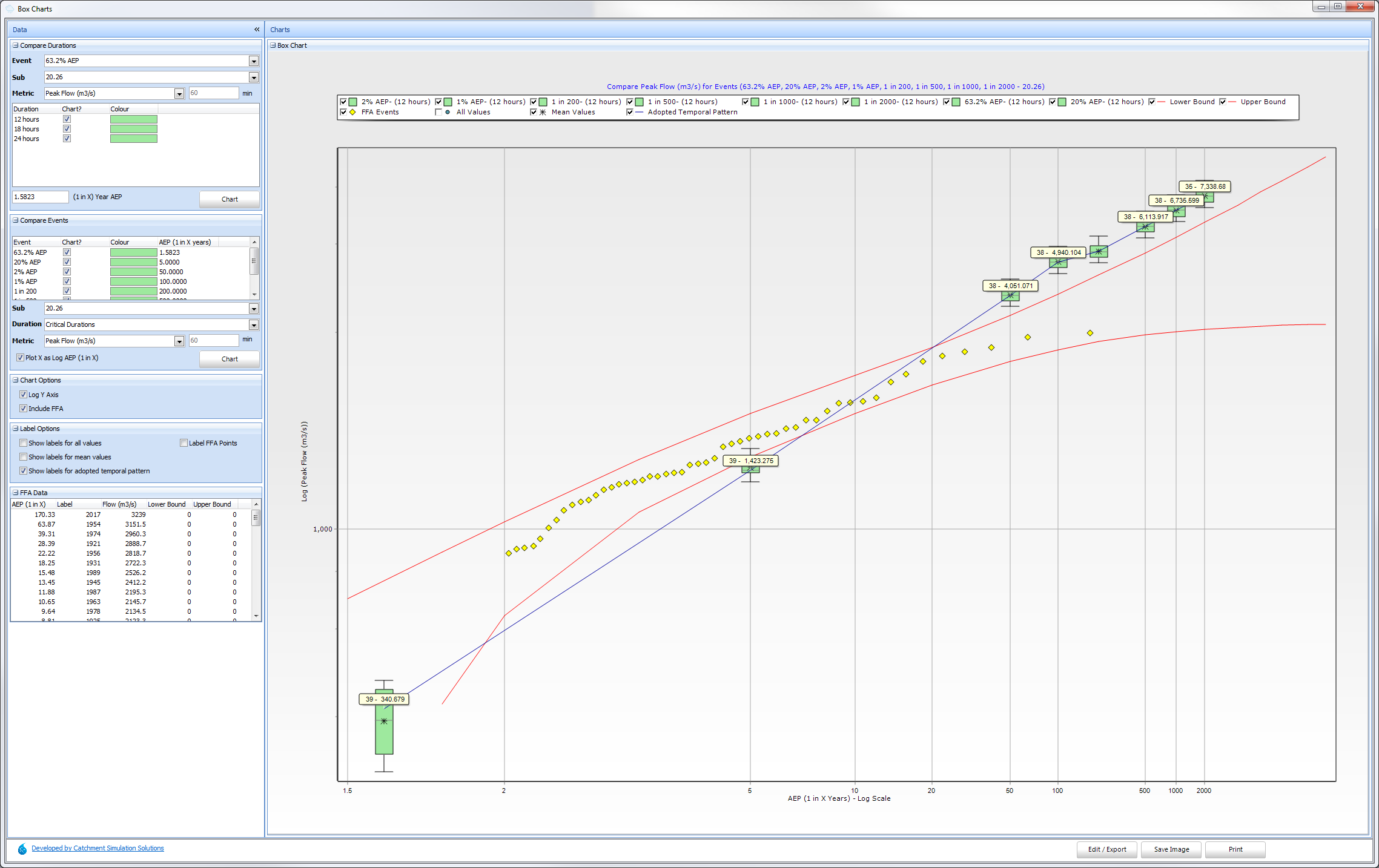 Flood Frequency Analysis data can also be displayed in this chart. It can be imported (from Flike or CSV) by right click in the FFA Data panel. It can then be included in the chart using the 'Include FFA' option in the Chart Options panel. At this points, events, their labels and confidence limits (where available) can be controlled by the Legend check boxes and Chart and Label options panels. This chart can then be used to verify how well (or not) the design events fit with a FFA analysis as shown in the example below.