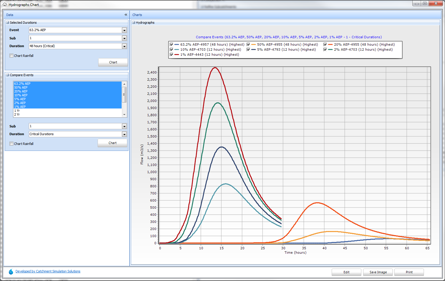 The hydrograph for any AEP, subcatchment, duration can also be plotted using the 'Hydrograph Charts' button. The hydrograph associated with the adopted temporal pattern will be displayed as a thicker line with a '(Critical)' suffix in the legend. Rainfall hyetographs can also be displayed using the 'Chart Rainfall' checkbox. The colours of the series can be edited using the Edit button. Labeling of peaks and rainfall values can be tailored via the Options panel.