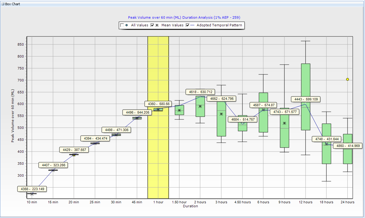 Storm Injector also provides for the charting of peak volume over a user defined time period in an effort to give insight into the selection of critical storms for volume sensitive catchments.This feature is available in both Box and Whisker charts and hydrograph charts.