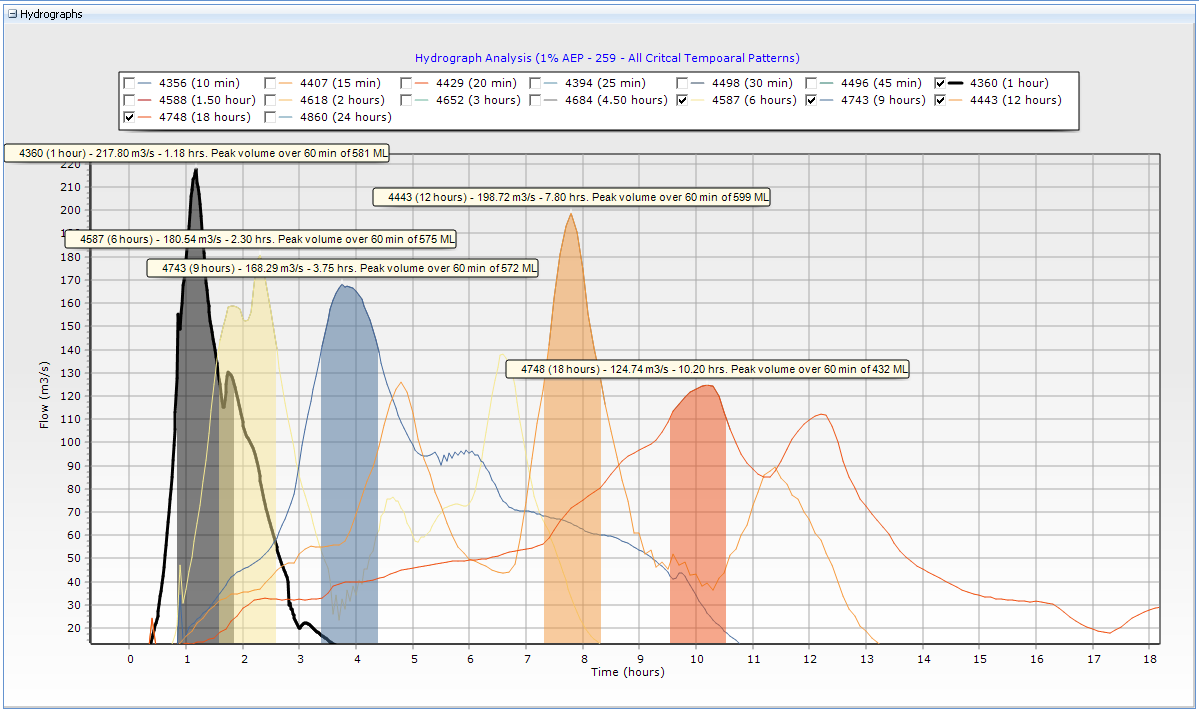 The adopted temporal pattern is always based on the peak flow criteria from the Settings. The flow (or volume or time to peak) corresponding to the adopted temporal pattern are linked by a line chart and labelled with their temporal pattern code and value for the selected metric.
