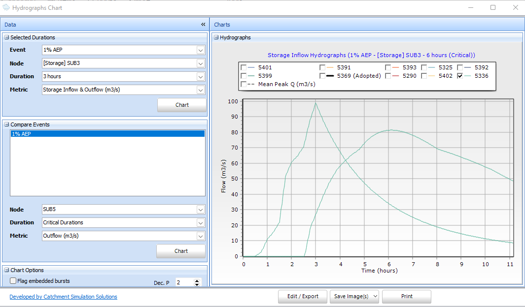 For storages, hydrographs can be plotted for storage inflow, outflow and stage where available (not RAFTS). There is also an option to chart inflow and outflow in the same series to help visualise attenuation.