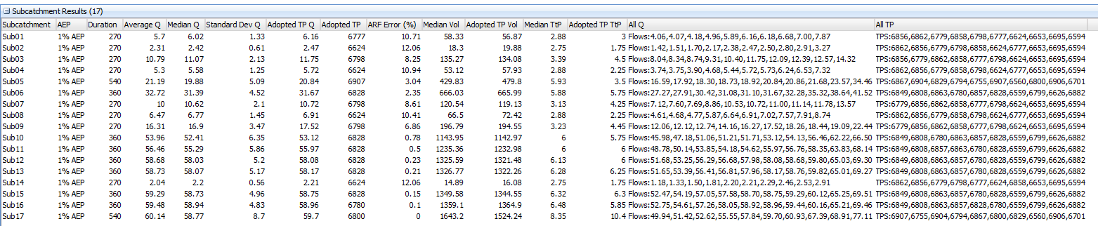 For the events, durations and subcatchments selected, the Subcatchment Results table will report: