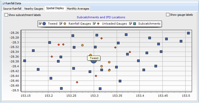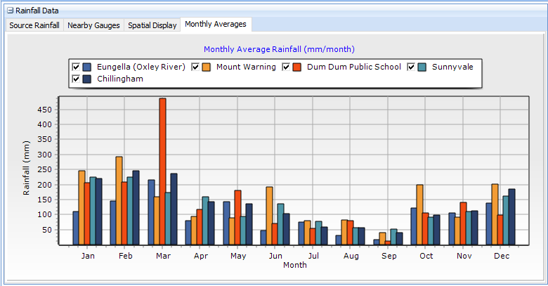 The Spatial Display tab charts the locations of the project subcatchments (if lat / long available), IFD Locations downloaded from the BOM (on the Storm Generator tab), rainfall datasets imported and nearby gauges that as yet have not been imported by Storm Injector. Monthly averages can be viewed in the Monthly Averages tab.
