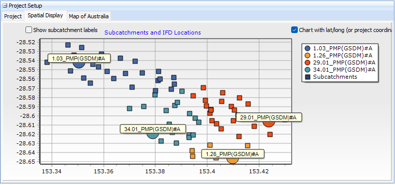 If you look at the spatial display, the subareas have been colour-coded by their assigned IFD locations. You may need to un-check "Show subcatchment labels"