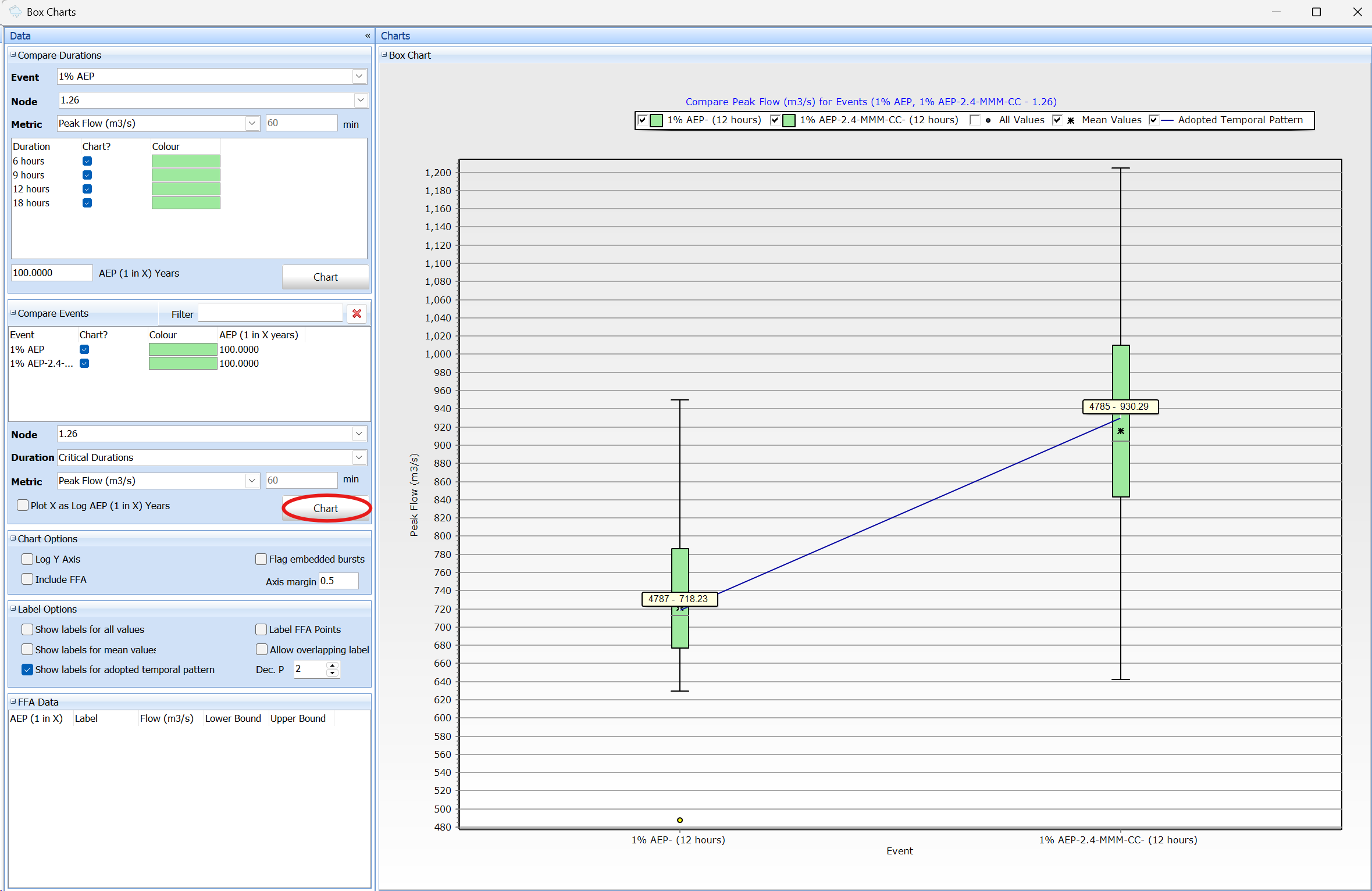 16.Click Box Charts and click Chart in the Compare Durations panel. You should see that it defaults to the catchment outlet (1.26). The chart should indicate a critical duration of around 12 hours with a mean flow of ~690 m3/s and an adopted TP of 4787.
