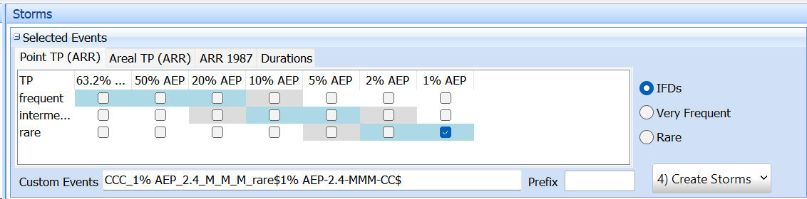 b.You should see that custom event code is created and added to the the Custom Events text box in the Selected Events panel. This code defines the storm to be created and no check boxes are required to be selected besides the durations. Leave the duration settings , click the IFDs checkbox and uncheck all except the 1% AEP - rare option which will be used as a comparison to the climate change event.