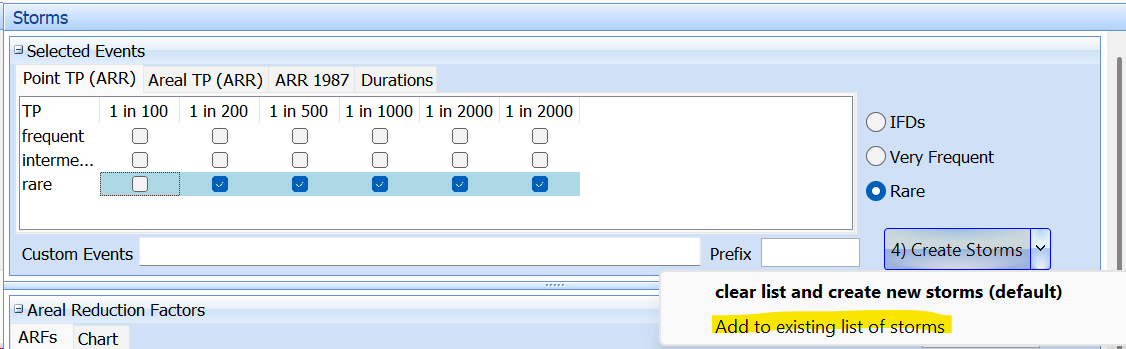 20.Again, In the "Selected Events" panel, check the Rare option and right click and select primary ensemble bins. You can un-check the 1 in 100 event as we already have the 1% AEP event as part of the standard IFD AEPs. Importantly, click on the drop down of the Create Storms and select 'add to existing list of storms'. Otherwise, the standard IFD AEP events will be removed.