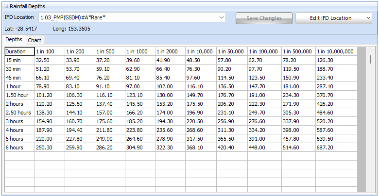 c.Click on 1) Import PMP Data. Navigate to the PMP Folder and Select all the PMP GSDM csv files. You should see the PMP csvs have been imported and their data can be viewed by clicking on a row in the All Locations table. On the right, you can see settings for the Area, PMP excedance probability (from ARR Fig 8.3.2) as well as the Extreme Event AEPs to be interpolated. This can be edited by right click.
