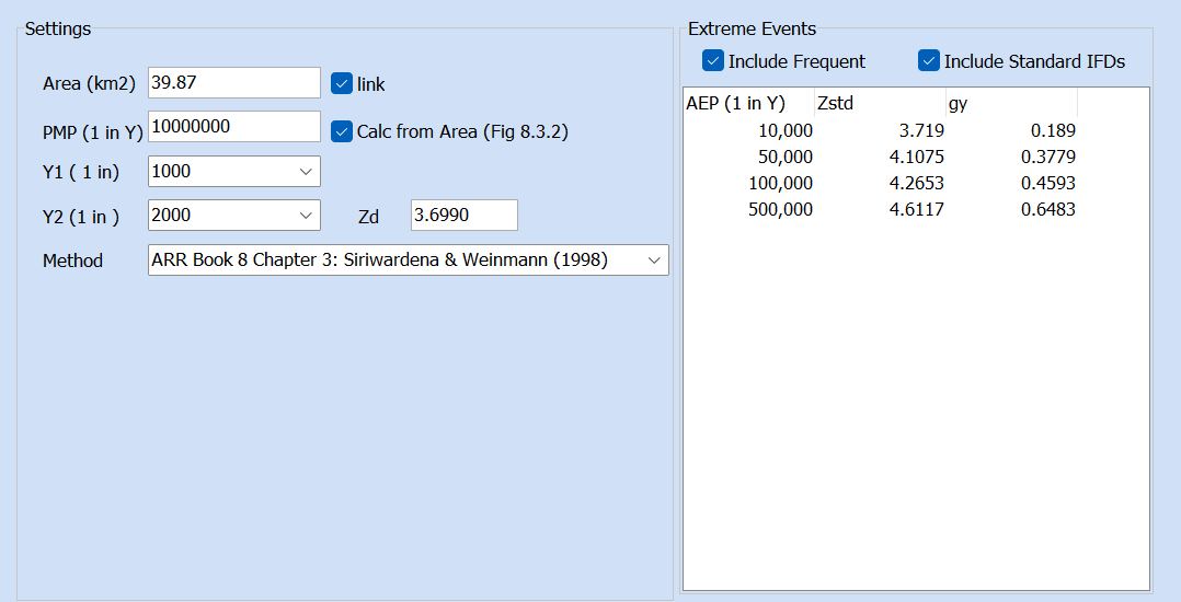 The Settings section shows the Area, PMP AEP and other parameters relevant to the method selected. The specific extreme events to be interpolated are listed in the table to the right and these can be edited via right click.