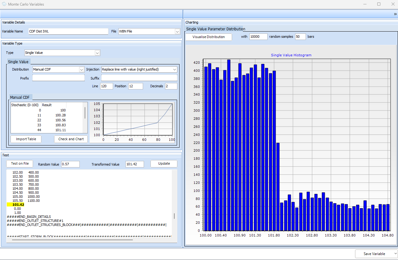 Finally, we will use the Monte Carlo Variables to examine the results when using a stochastically generated number transformed through a distribution to cater for the uncertainty in the Initial Water Level (IWL). We will try both a Normal distribution of IWL as well as a Cumulative Density Function (CDF) approach.