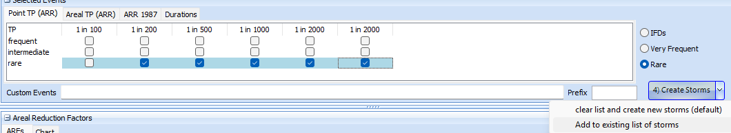 10.Now, let's redo the analysis with the reduced number of durations for all standard AEPs. Switch to the Point TP (ARR) tab, right click and 'Select primary ensemble bins'. Click 4) Create Storms. Let's also do Rare events by clicking the Rare checkbox, select events 1 in 200 through to 1 in 2000 (no need to do 1 in 100 as we have the 1%). Importantly, click the drop arrow on '4) Create Storms' and select 'add to existing list of storms' (or it will overwrite the standard events).