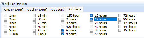 9.After running and processing these models (Buttons 6 and 7) on the Model Runs tab, you should see that the catchment has a critical duration of about 12 hours (Click Box Charts and click Chart in Compare Durations panel). Going forward, we will restrict our analysis to (6-18 hours). To do, this go to the Durations tab inside Selected Events panel on Storm Generator tab, right click and un-check all and then select only 6, 9, 12 and 18 hours.