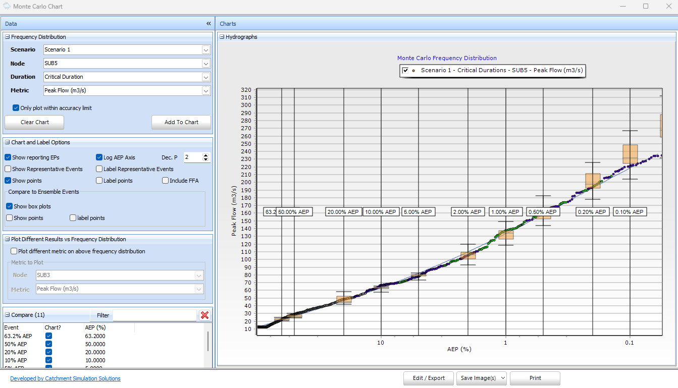 14.Note the speed of the MC approach since it is able to define all the AEP design flows in a single run. The tabular results can be seen in the results panel. The frequency curve can be seen using the Result Charts button. You can see the setting in the image below used to generate the plot. You should see a good match to the ensemble results until the very rare results such as 1 in 1000 where the MC distribution start to dip below the box and whisker plot quartiles.