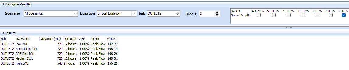 16.Create a new MC Scenario called 'Low IWL' and select the 'ex3_Storage_partfull_100.wbn' when clicking 2) Prepare MC Runs. Click 3) Run and wait for the results to process. Create another scenario called 'High IWL' and select the 'ex3_Storage_partfull_105.wbn' when clicking 2) Prepare MC Runs. Click 3) Run and wait for the results to process. You can compare the 1% Peak Flow results at the outlet as shown in the image below. It can be seen that the 1% AEP model peak outflow increases with a higher IWL assumption.