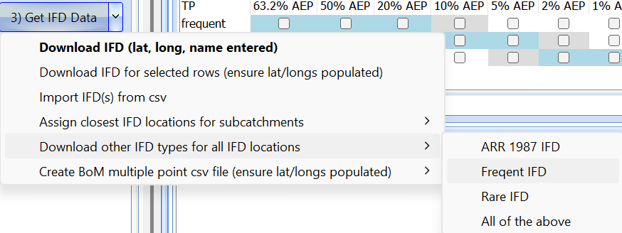 6.Click the button '3) Get IFD Data' drop arrow, then 'Download other IFD types for all IFD locations >> Frequent IFD' and then repeat for Rare IFD, in order to get all necessary rainfall data.