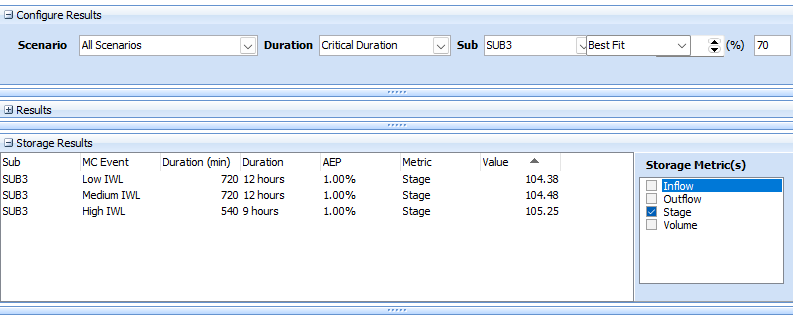 17.Scenario 1 is not the best name for our original scenario, you can rename it Medium IWL by right clicking on the scenario in the Selected Scenario panel and selecting 'Rename scenario' . You can also compare the stage results by configuring the results as shown in the image below. It can be seen that the 1% peak stage also increased based on the IWL assumption.