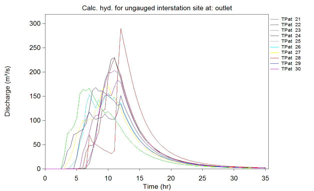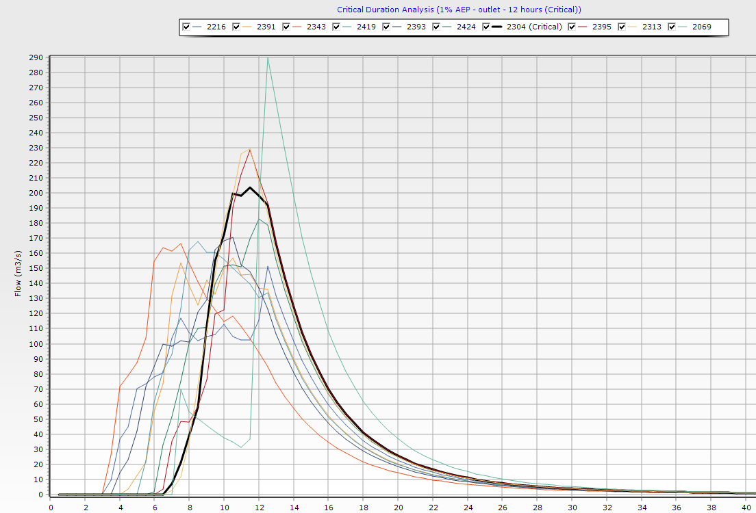 Using this procedure, Storm Injector generates near identical results to RORB. Storm Injector identifies the 12 hour storm as being critical and TP 2304 as being the critical temporal pattern with a peak flow of 203.6 m3/s. This matches the results for TP 23 in the RORB result which is the first TP above the mean for this duration. This verifies that RORB and Storm Injector are calculating the same ARF and applying the temporal patterns in an identical fashion.